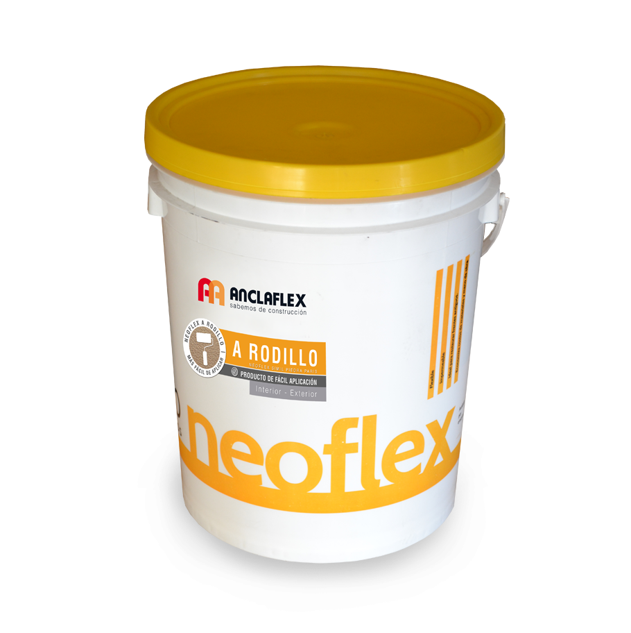 Aplicar Anclaflex Recubriento Base según color elegido y luego dejar secar. Antes de aplicar Neoflex a Rodillo mezclar bien el contenido del envase. Aplicar paños completos, con el fin de evitar empalmes o solapamientos. En el caso de envases con diferente lote, mezclar entre sí para homogeneizarlas. Luego de la aplicación de Anclaflex Recubrimiento Base, diluir Neoflex a Rodillo con un máximo de 20% de agua en volumen hasta obtener la viscosidad de aplicación. Realizar pasadas cortas y cruzadas cubriendo 0.25m2 (0.50cm x 0.50cm) aprox., con el fin de tener una superficie homogénea y pareja, cargar el rodillo (de pelo corto o mediano) y aplicar una pasada en forma vertical y otra horizontal, luego sin cargar el rodillo, volver a repasar en ambos sentidos para unificar la superficie y textura, una ver realizado este proceso, seguir con el siguiente tramo. Dejar transcurrir de 4 a 6 hrs y aplicar la 2da y 3er mano, siguiendo las indicaciones antes descriptas.